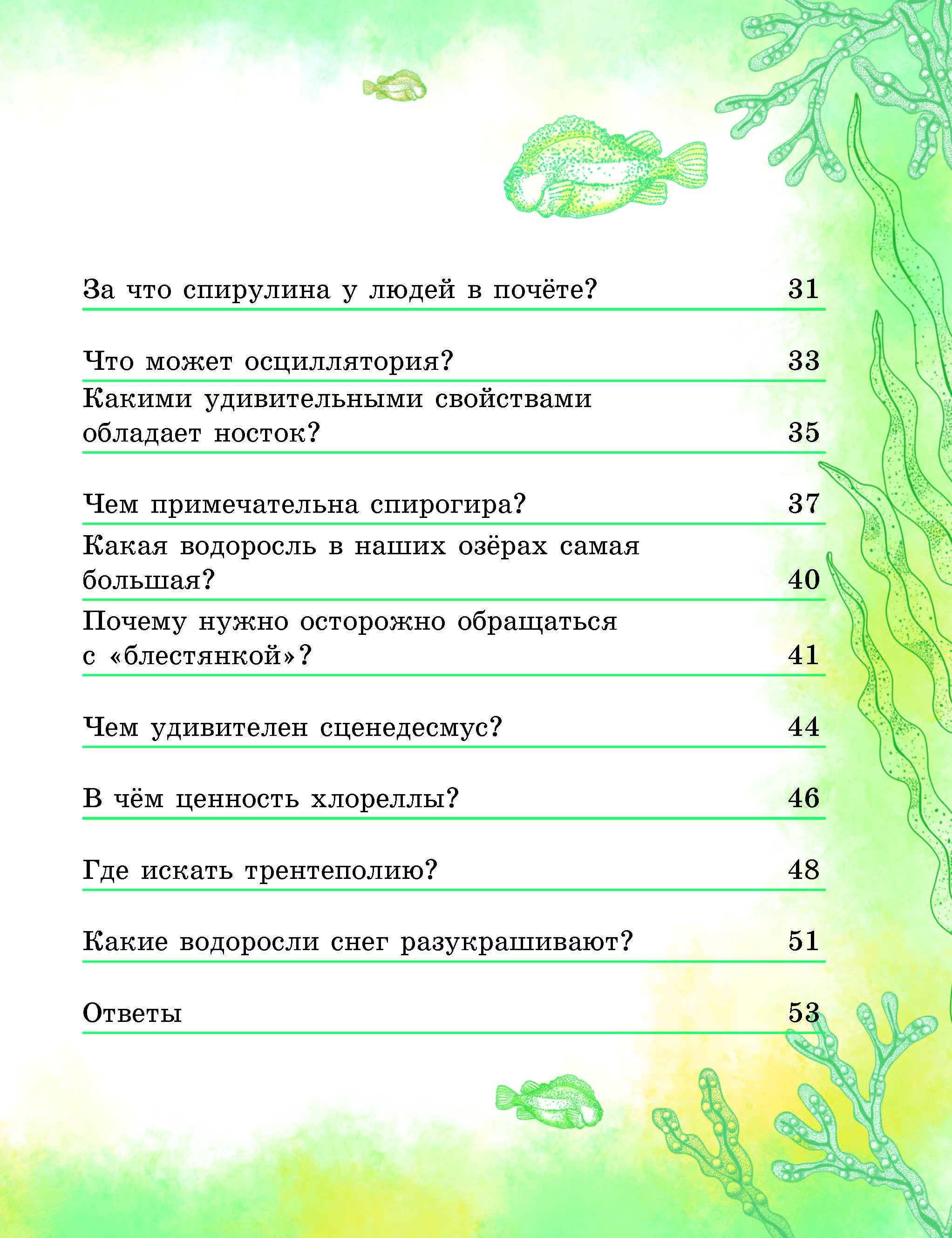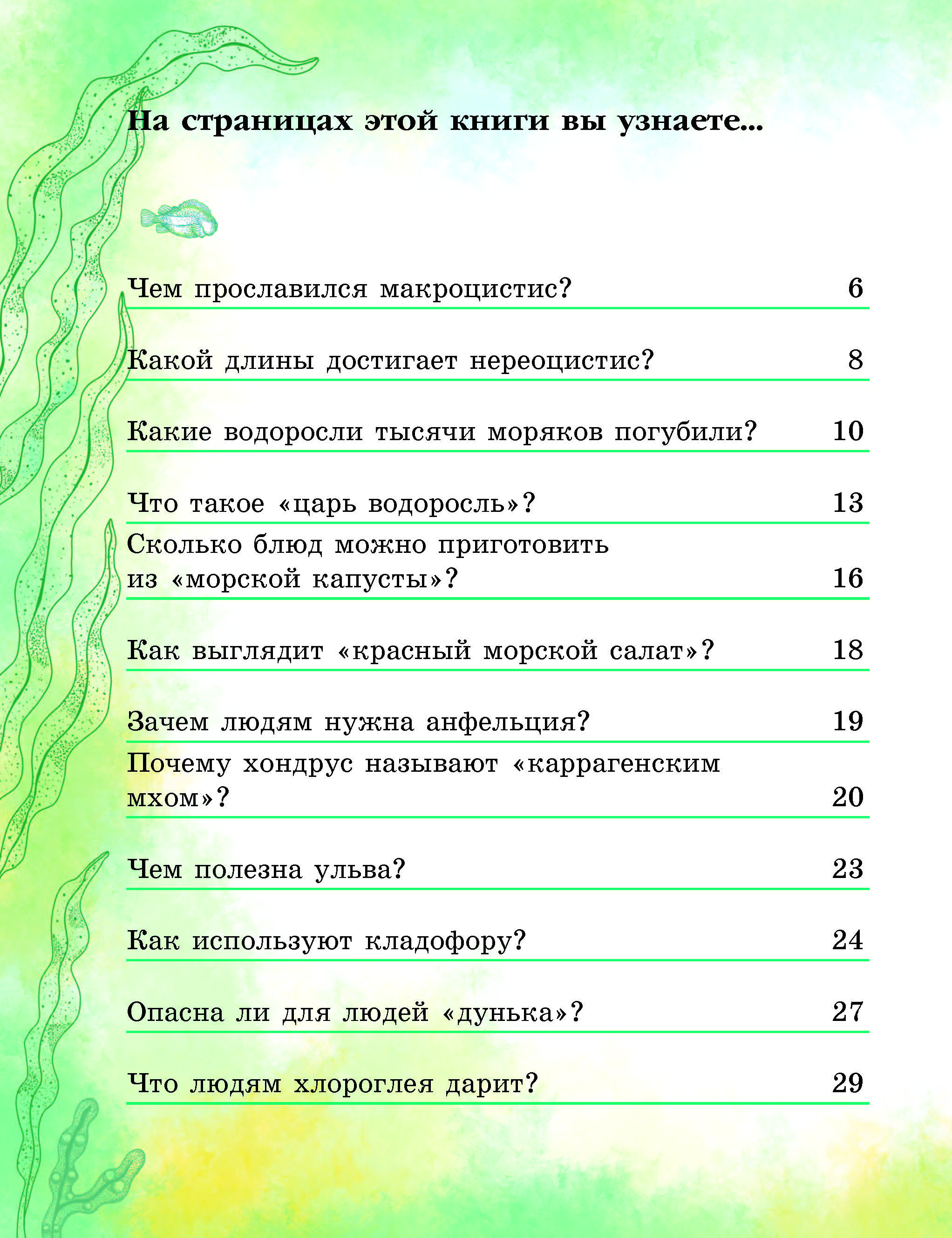 В этой книге Дед Природовед даст ответы на вопросы: какая водоросль — чемпион по длине? Какие водоросли тысячи моряков погубили? Сколько блюд из «морской капусты» можно приготовить? Как выглядит «красный морской салат»? Где обитает «дунька», не опасна ли она для людей? Что такое «царь водоросль»? Что людям хлороглея дарит? Какие водоросли снег разукрашивают?